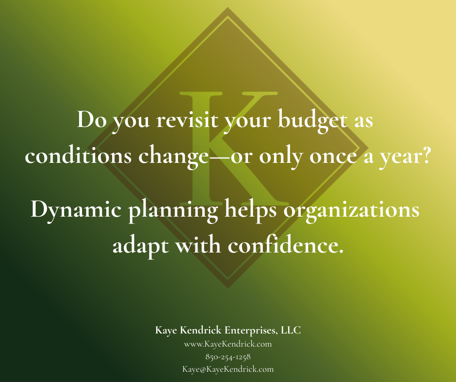 Conditions will continue to change. Organizations that acknowledge this reality and plan accordingly are better positioned to adapt, respond, and grow. Through its CPA, controller, audit, consulting, and coaching services, Kaye Kendrick Enterprises, LLC helps clients move beyond static budgeting toward disciplined, dynamic planning frameworks that support informed decision-making and long-term financial confidence.